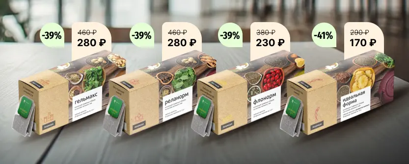 Цинсил-Т — комплексный препарат на основе цинка, глицина и пиридоксина для продления активного долголетия. Воздействует на ключевые звенья патогенеза ускоренного старения, корригирует работу ферментов и гормонов, восстанавливает иммунный и антиоксидантный статус. Является доказанным средством профилактики онкопатологии. Поддерживает иммунитет, здоровье кожи, снижает воспаление, нормализует работу нервной системы. Цена по акции — 650 ₽* / 58 ₽ бонусов *Количество продукции по акции ограничено! Акция с 1 по 30 апреля: чаи серии Аюрведа со скидками!Гельмакс — фиточай с иммуномодулирующими и антипаразитарными свойствами. Снимает симптомы интоксикации организма. Повышает тонус и иммунитет. Нормализует функции кишечника и легких. Препятствует росту грибковой флоры после терапии антибиотиками. Применяется при нарушениях ЖКТ, снижении иммунитета, паразитарных инвазиях. Цена по акции — 280 ₽* / 27 ₽ бонусов Реланорм — фиточай для нормализации работы центральной нервной системы. Снижает стрессовую нагрузку и повышает производительность нервной системы. Помогает нормализовать цикл сон-бодрствование. Оказывает иммуномодулирующее действие. Цена по акции — 280 ₽* / 27 ₽ бонусов Флонорм — фиточай для нормализации работы мочевыводящих путей. Оказывает умеренное противовоспалительное, спазмолитическое и диуретическое действие. Применяется при воспалительных заболеваниях почек и мочевого пузыря, нарушении мочеиспускания, мочекаменной болезни. Цена по акции — 230₽* / 17 ₽ бонусов Идеальная форма Ананас — идеальное средство для коррекции фигуры и улучшения работы желудочно-кишечного тракта. Способствует очищению организма от шлаков и токсинов, улучшает перистальтику кишечника, снижает уровень всасывания холестерина и жиров из кишечника в кровь. Состав: зеленый чай, лепестки суданской розы, семя льна, семена укропа, слоевище ламинарии, александрийский лист, ароматизатор ананас. Цена по акции — 170 ₽* / 11 ₽ бонусов *Количество продукции по акции ограничено! Акция c 1 по 10 апреля: пептидный комплекс для мужской половой системы со скидкой 44 %!